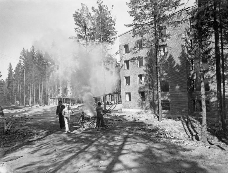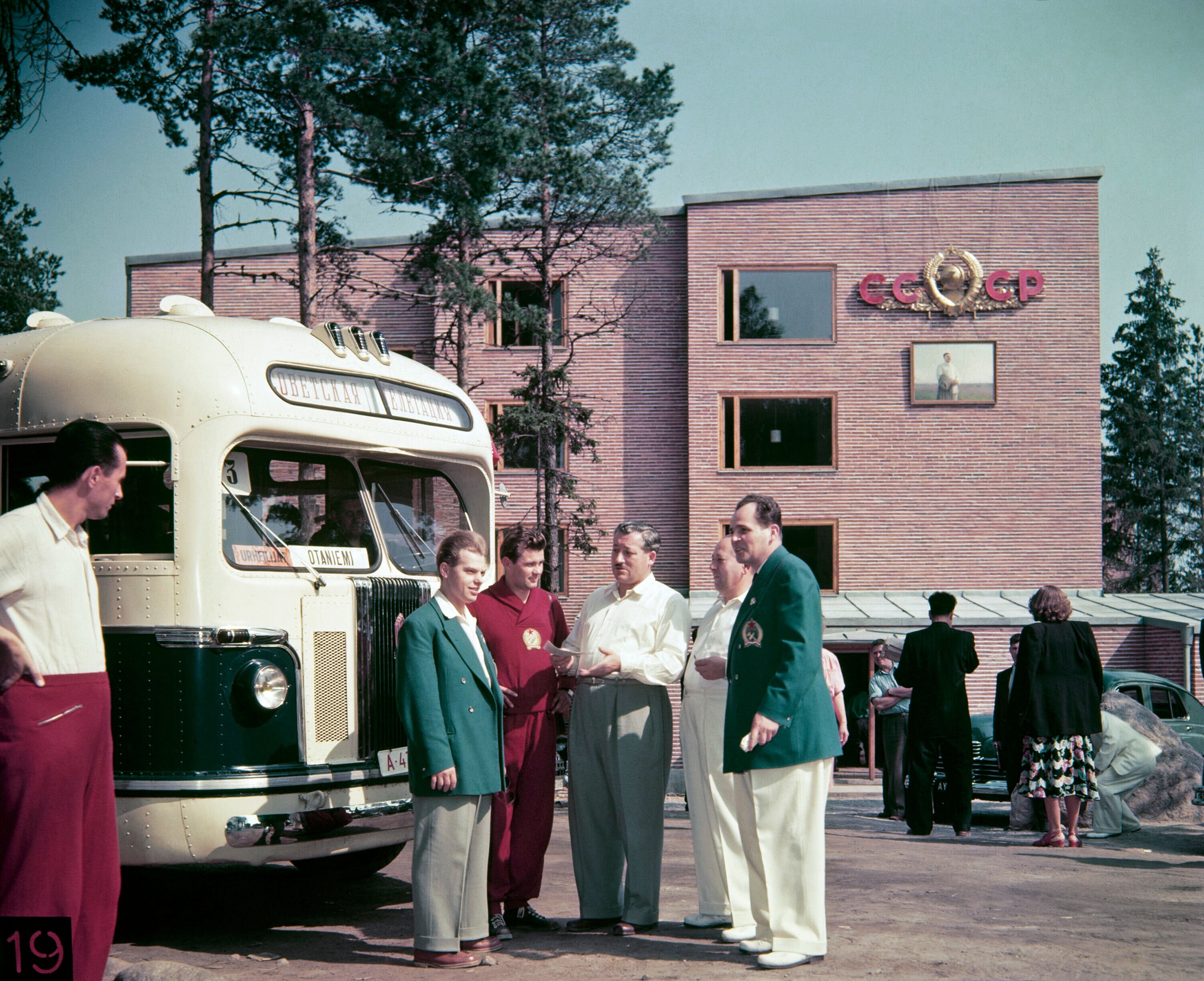 Helsingin olympialaisten aikaan vuonna 1952 Otaniemen teekkarikylässä oli Neuvostoliiton olympiajoukkueen majapaikka. Teekkarien asuntolan seinässä näkyy Neuvostoliiton tunnukset ja Josef Stalinin kuva. Valokuvaaja: Olympia-Kuva Oy. Kuva: Helsingin kaupunginmuseo.