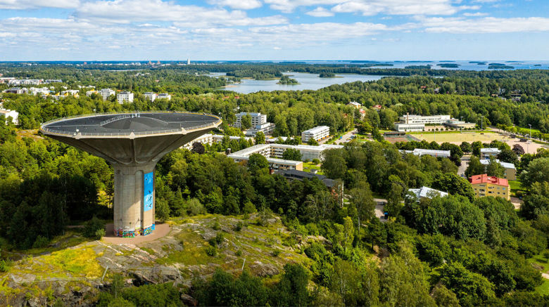 Vesitornin kyljessä on graafikko, rap-artisti Heikki Kuulan suunnittelema ympäristötaideteos ”kuula”, joka valmistui vuonna 2006. Teos on 15 metriä korkea. Suunnittelija valittiin suunnittelukilpailun kautta. Heikki Kuula oli teoksen tehdessään vasta 17-vuotias. Valokuvaaja: Käkelä, Mikko. Kuvausaika: elokuu 2020. Kuva: HSY.