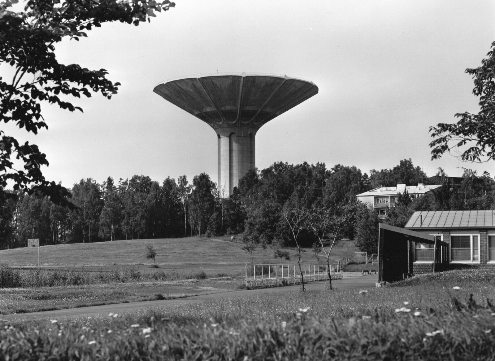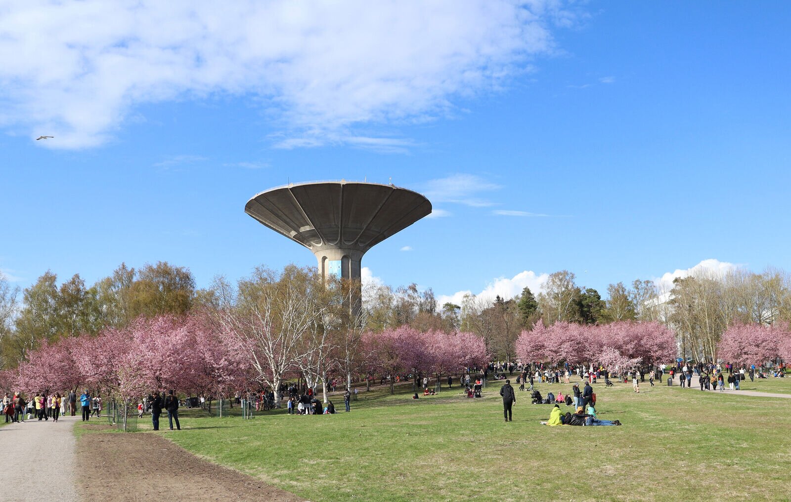 Vesitorni kohoaa Kirsikkapuiden takana Roihuvuoren Kirsikkapuistossa. Kuva on vuodelta 2022 Hanami-juhlan jälkeiseltä päivältä. Valokuvaaja: Pyykkö, Katja. Kuvausaika 14.05.2022. Kuva: Helsingin kaupunginmuseo.