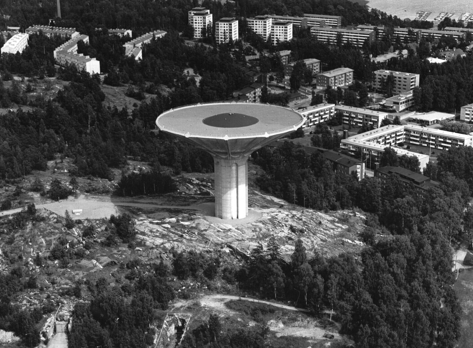 Roihuvuoren vesitorni rakennettiin vuosina 1976–1977. Tornin vesisäiliö valettiin maassa ja nostettiin sitten vartta pitkin huipulle. Vesisäiliön nostoon kului yhteensä noin 60 tuntia. Rakentamisesta vastannut Rakennusosakeyhtiö Hartela mainosti lähes 10 000 tonnia painavan säiliön nostosuoritusta uutena ”maailmanennätyksenä”. Valokuva: Mannelin. Kuvausaika 15.7.1979. Kuva: HSY.